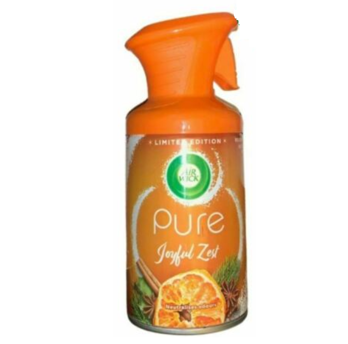 Denne Air Wick Pure Aerosol med skøn duft af Joyful Zest, som giver dit hjem en dejlig friskhed. Sprayen efterlader ikke fugtige pletter, da der ikke er tilsat vand.