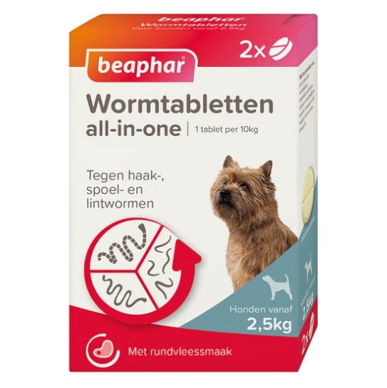 All-in-One ormetabletterne fra Beaphar er velegnede til hunde over fem måneder og fra 2,5 kg op til 40 kg kropsvægt.