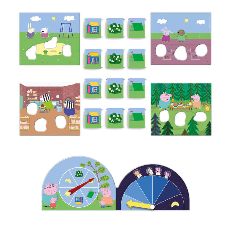 • Et samarbejdsspil, hvor børn står op før mørkets frembrud sammen skal opdage, hvor Peppa og hendes venner har gemt sig! • Børn leger gemmeleg med Peppa og hendes venner, find deres gemmesteder og bring dem tilbage til mor og far, før det bliver mørkt. • Spillet indeholder 4 kort, hver med 3 karakterer til at spille i de former, der passer til dem, 12 papkasser til brug som gemmesteder, en terning og en timer. • Fjern de 12 tegn fra papkortene og gem dem forskellige steder. Børn skiftes til at kaste terningerne, åbne kasserne baseret på resultatet og få fat i karakteren. • Formålet med spillet er alle karaktererne på det tilsvarende kort, før timeren slutter på månen (begyndelsen af natten).