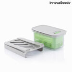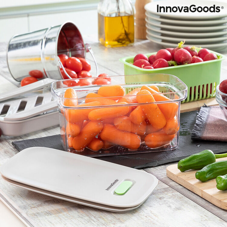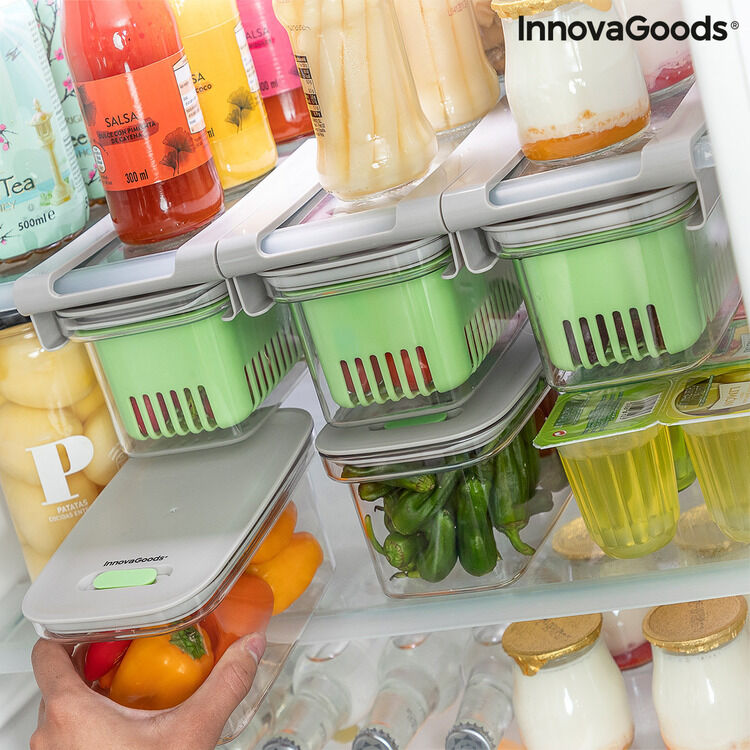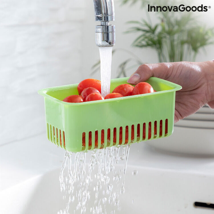 InnovaGoods er her for at hjælpe dig med at gøre madlavning til en nem og sjov aktivitet ved at tilbyde dig de bedste nye ting til dit køkken, som f.eks. Mad Bevarelse Container Prefo InnovaGoods ! Se det store udvalg af produkter af høj kvalitet, som skiller sig ud takket været deres funktionalitet, effektivitet og innovativt design!En original og komplet køleskab og fryser sikker opbevaring af fødevarer, der holder maden frisk og i god stand i længere tid. På grund af sin oprindelige multi-funktion og multi-position design, er det meget alsidigt og kan tilpasses forskellige anvendelser og rum. Det har et ventileret låg og silikone læbe til lufttæt og spildsikker lukning, selvom ventilen kan åbnes for luftcirkulation, hvis det foretrækkes. Det omfatter en aftagelig afløbskurv med ventilations- og filtreringshuller, der fremmer luftcirkulationen inde for bedre bevarelse og kan også bruges til at vaske og dræne mad. Det har også en stativ med guide, så det let kan hænges på køleskabet, hvis det ønskes, da det er aftageligt og valgfrit til brug. Denne multi-purpose beholder forlænger levetiden og friskheden af fødevarer og er velegnet til alle typer fødevarer, selv om den er specielt designet til små friske fødevarer, såsom cherrytomater, baby gulerødder, kanoner, arugula, majs, hindbær, blåbær, druer osv. Ideel til at organisere og holde orden i køleskabet, hvilket gør mest muligt ud af den tilgængelige plads. For det andet kan den bruges som en madkasse til at transportere mad. Til rengøring skal den vaskes i hånden, da det ikke er opvaskemaskine sikkert. Ikke egnet til brug i mikrobølgeovnen.