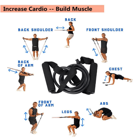 Pakken indeholder 5 træningsbånd, der er fremstillet i gummilatex af høj kvalitet. Hvert bånd er 122 cm langt.